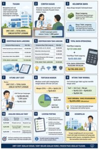 Untuk memberikan gambaran praktis mengenai penyusunan unit cost rumah sakit, berikut disajikan simulasi sederhana perhitungan unit cost pada layanan poliklinik spesialis. Simulasi ini bertujuan menunjukkan bagaimana seluruh biaya operasional dikumpulkan, kemudian dibagi dengan jumlah output layanan sehingga diperoleh biaya riil per pasien.